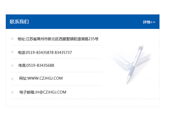 地址:常州市新北區友邦商務大廈1幢16、17層  電話:0519-85101652  傳真:0519-85112595  郵編:213022  網址:www_cz-jiayue_cn.jnteikoku.com  郵箱:xiajifengaa@163.com